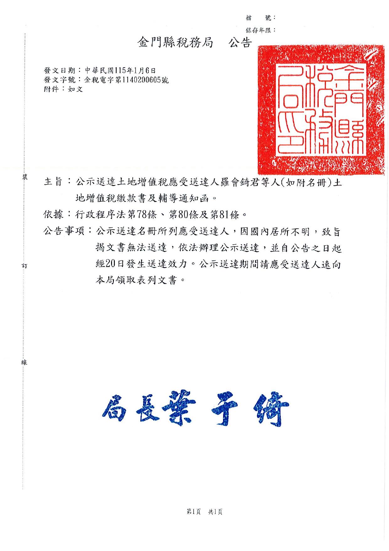 115.01.06土地增值稅行政文書公示送達公告(115年1月6日金稅電字第1140200605號)。