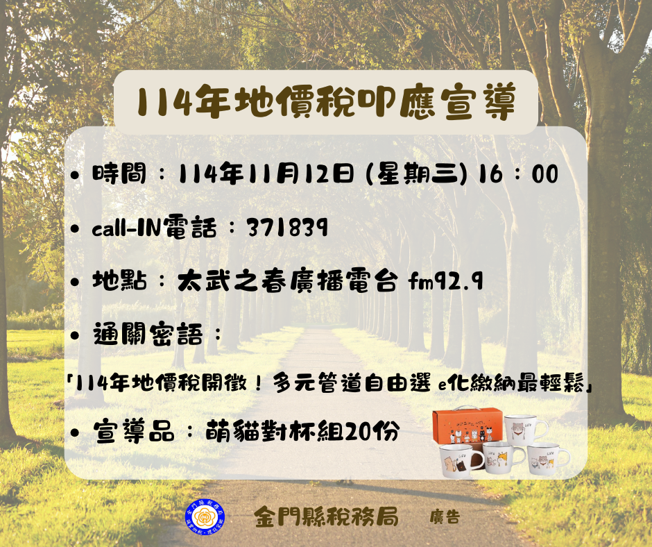 稅務局為配合114年度地價稅開徵,於114年11月12日下午4點到5點,於太武之春廣播電台調頻FM92.9辦理宣導活動,開放叩應電話 371839,稅務局備有精美宣導品(萌貓對杯組)共20份,歡迎鄉親屆時收聽廣播參加叩應。