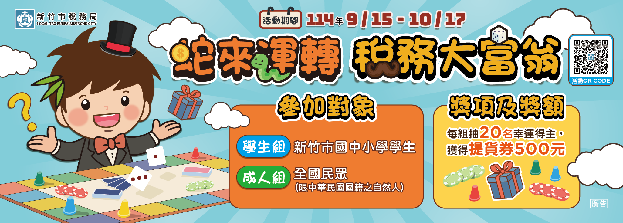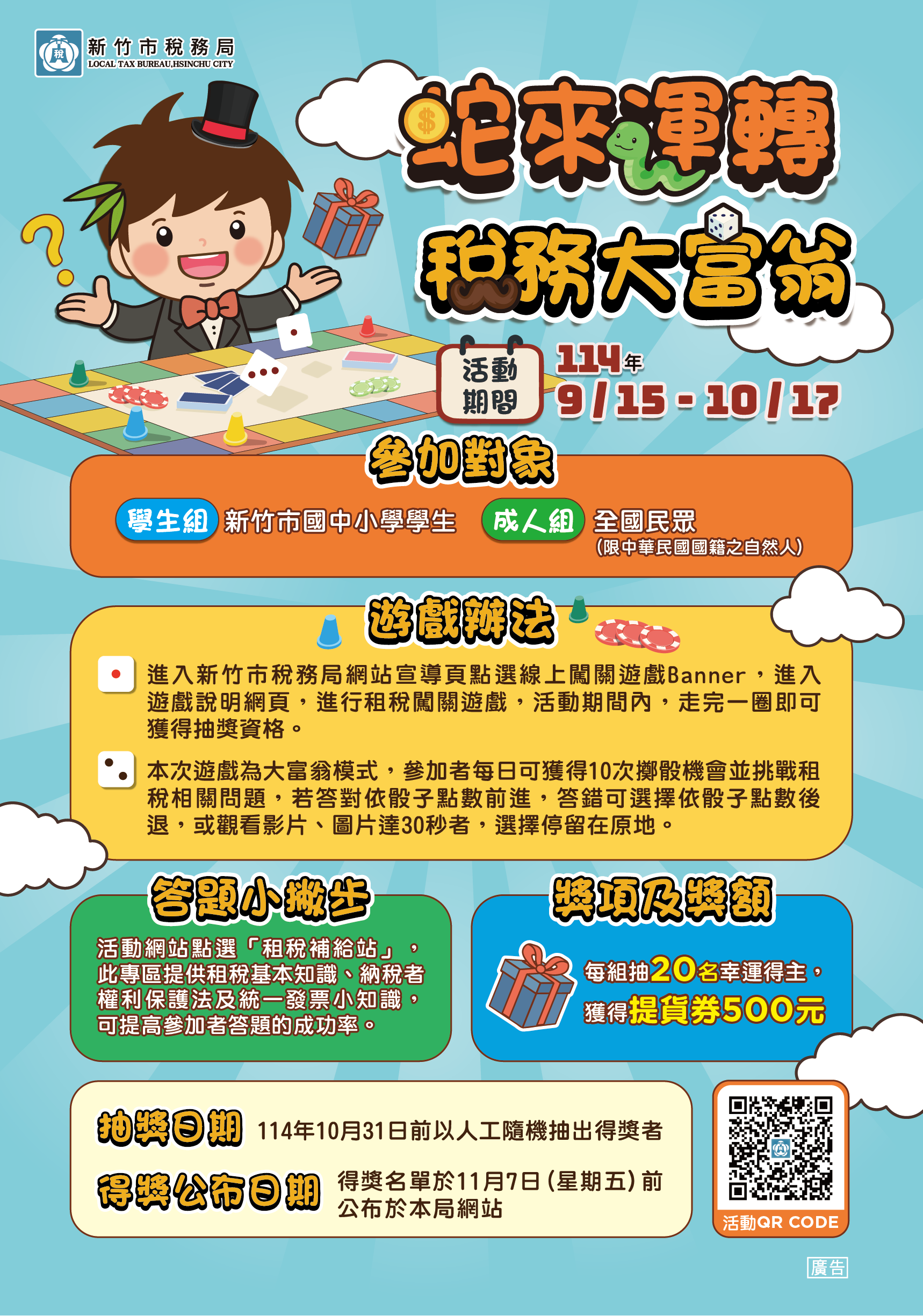 (三)闖關遊戲:進入新竹市稅務局網站宣導頁點選網路闖關遊戲Banner,進入遊戲網頁。參加者每日可獲得10次擲骰機會並挑戰租稅相關問題,若答對依骰子點數前進,答錯可選擇依骰子點數後退,或觀看影片或圖片達30秒者,選擇停留在原地。活動期間內走完一圈者,即獲得抽獎資格。