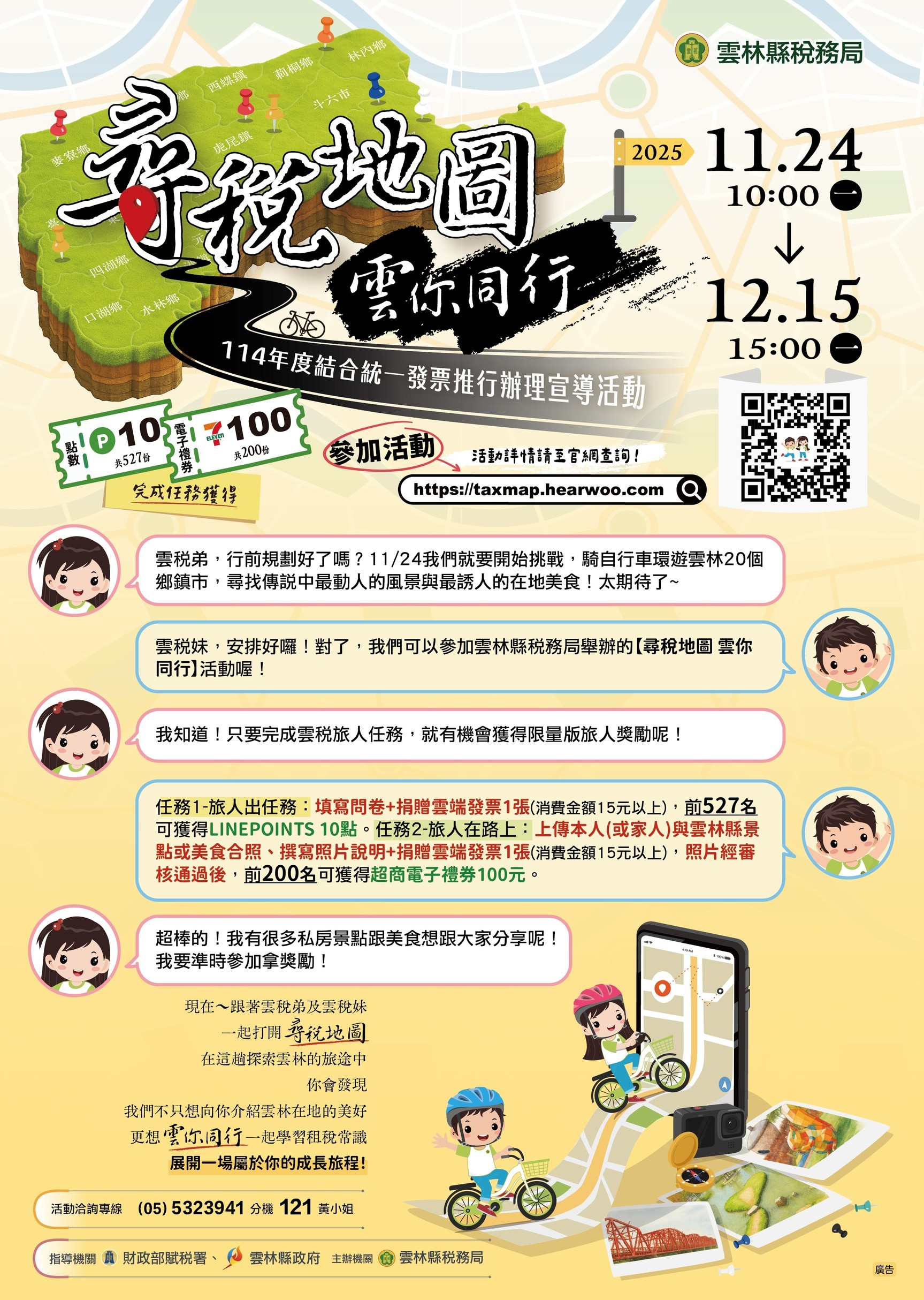 活動訊息如下: (一)活動時間:114年11月24日上午10時起至114年12月15日下午3時止。 (二)參加對象:一般民眾。 (三)活動網址:https://taxmap.hearwoo.com。 (四)更多活動詳情請參考本活動網站。