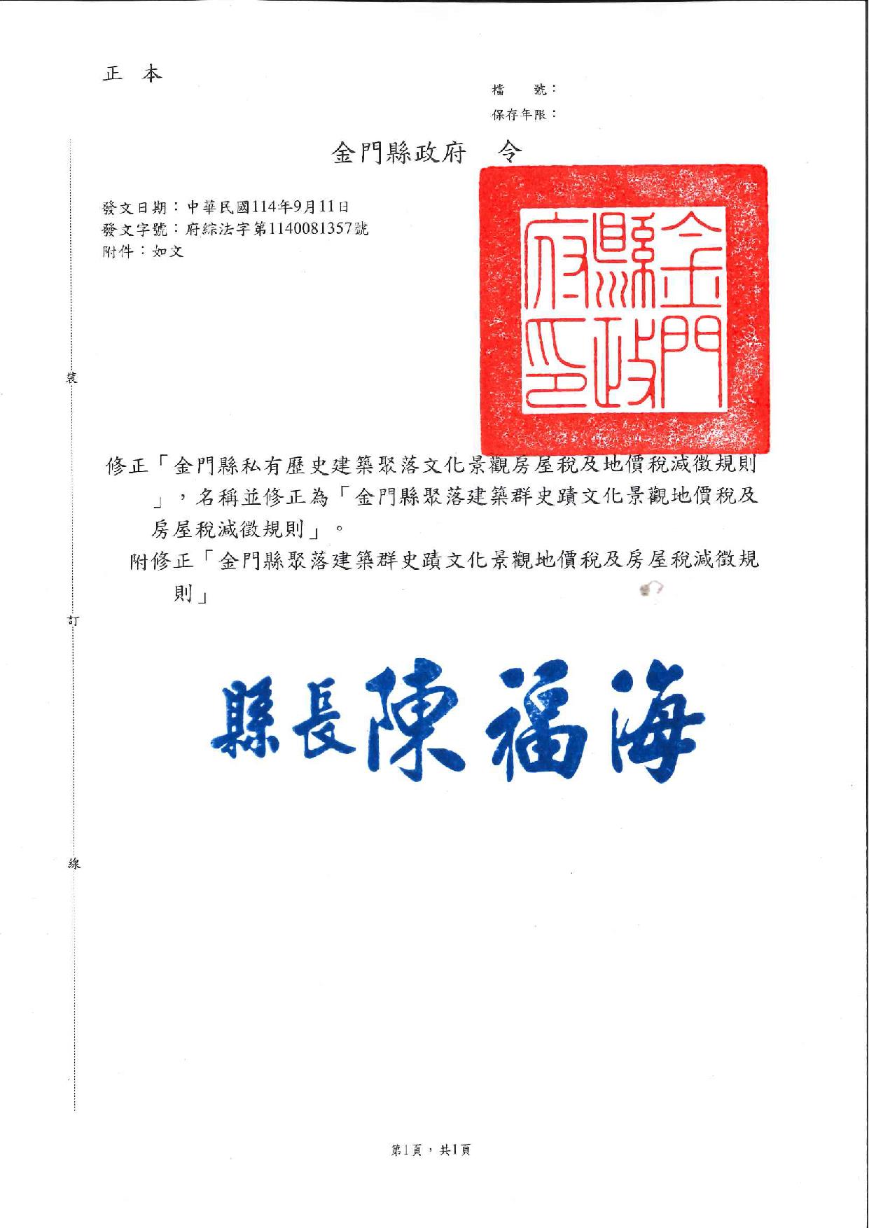 發布-金門縣政府令-修正「金門縣聚落建築群史蹟文化景觀地價稅及房屋稅減徵規則」含修正總說明、對照表及條文)